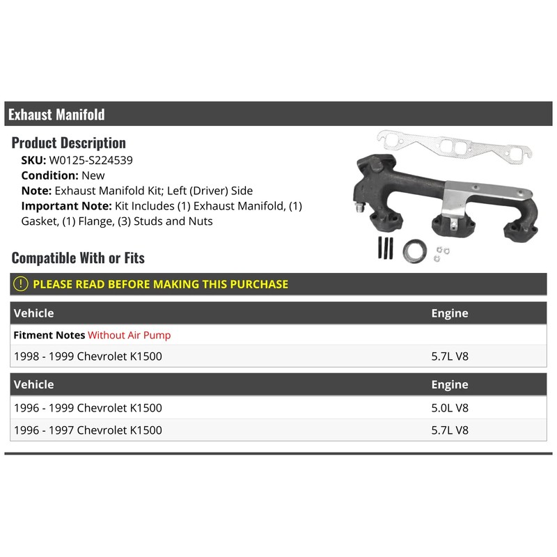 - Compatible with or fits: (Note: Without Air Pump; 1998 - 1999 Chevy K1500 5.7L V8) (1996 - 1999 Chevy K1500 5.0L V8 | 1996 - 1997 Chevy K1500 5.7L V8)