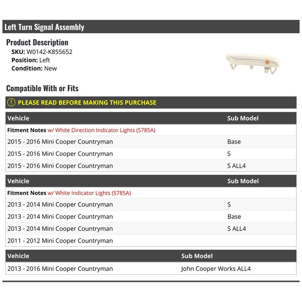 - Compatible with or fits: (Note: w/ White Direction Indicator Lights (S785A); 2015 - 2016 Mini Cooper Countryman Base | 2015 - 2016 Mini Cooper Countryman S | 2015 - 2016 Mini Cooper Countryman S ALL4) (Note: w/ White Indicator Lights (S785A); 2013 - 2014 Mini Cooper Countryman S | 2013 - 2014 Mini Cooper Countryman Base | 2013 - 2014 Mini Cooper Countryman S ALL4 | 2011 - 2012 Mini Cooper Countryman) (2013 - 2016 Mini Cooper Countryman John Cooper Works ALL4)