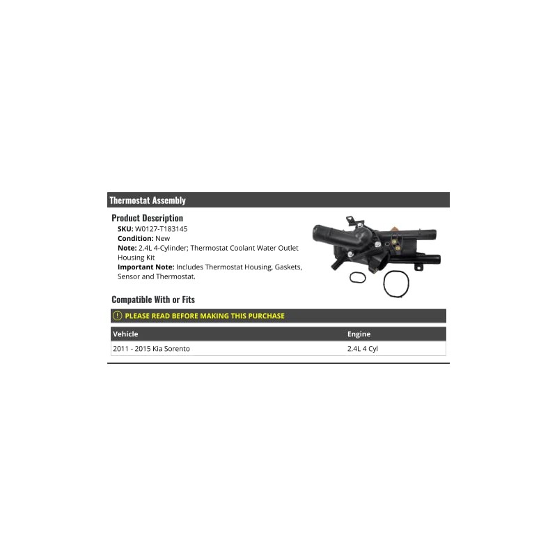Marketplace Auto Parts Thermostat Coolant Water Outlet Housing Assembly Kit - with Gaskets, Sensor, and Thermostat - Compatible with 2011-2015 Kia Sorento 2.4L 4-Cylinder