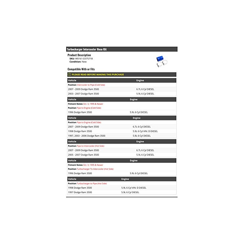 - Compatible with or fits: (Position: Intercooler to Pipe (Cold Side); 2007 - 2009 Dodge Ram 3500 6.7L 6 Cyl DIESEL | 2003 - 2007 Dodge Ram 3500 5.9L 6 Cyl DIESEL) (Note: Oct. 3, 1995 & Newer; Position: Pipe to Engine (Cold Side); 1996 Dodge Ram 3500 5.9L 6 Cyl DIESEL) (Position: Pipe to Engine (Cold Side); 2007 - 2009 Dodge Ram 3500 6.7L 6 Cyl DIESEL | 1998 Dodge Ram 3500 5.9L 6 Cyl VIN: D DIESEL | 1997, 2003 - 2006 Dodge Ram 3500 5.9L 6 Cyl DIESEL)