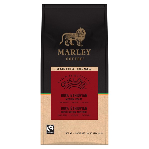 - Marley Coffee One Love is a Fair Trade Certified, medium roast coffee, 100% Ethiopian, balanced and smooth, with exotic hints of berry.