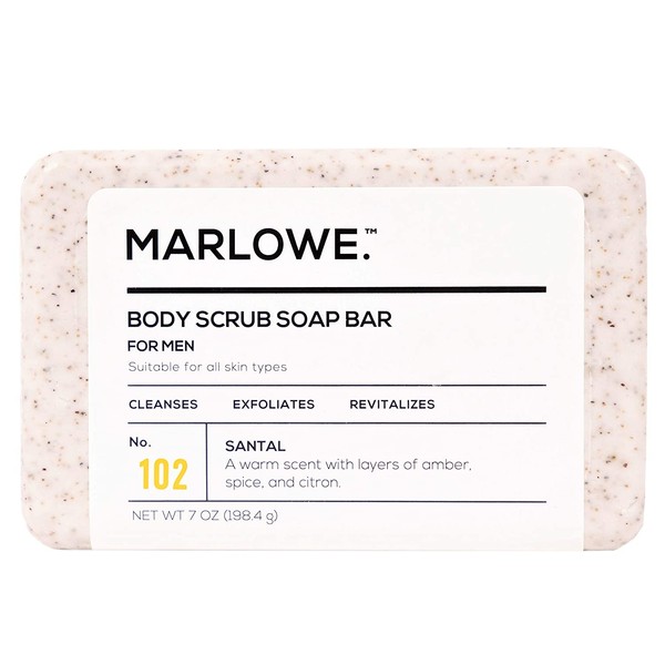 MARLOWE. No. 102 Men's Body Scrub Soap 7 oz | Warm Santal Scent | Best Exfoliating Bar for Men | Made with Natural Ingredients | Green Tea Extract | Updated Scent