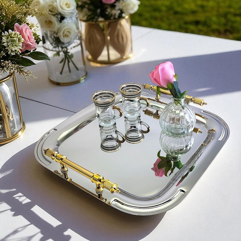 - An effortlessly charming decorative piece at an affordable price. Featuring a gold-plated, high-quality iron finish with a mirrored reflection, it's perfect for the holidays or everyday use. This multi-purpose serving tray is ideal for buffet and catering services.