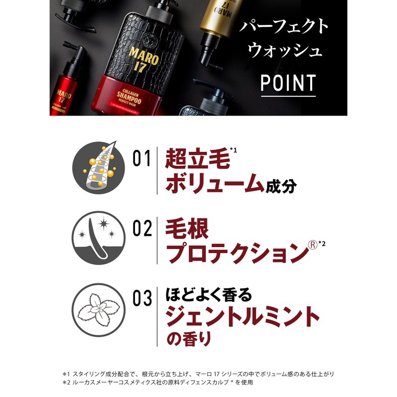 - (Volume) Each strand of hair is super plush. The volume ingredients are adsorbed on it. Feel the volume that rises from the root like after hairstyling. (* Formulated with styling ingredients, launched from the root to create a voluminous finish in the Maro 17 Series)
