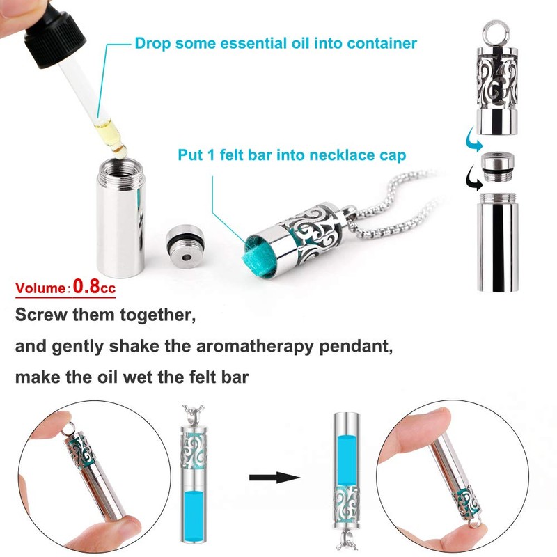 - Easy to Use: Our essential oil diffuser necklaces have a container at the bottom that holds approximately 0.8cc of essential oils. Instead of constantly dripping essential oils onto the felt pad like other aromatherapy necklace, you place the felt strip in the hollow and add the oils to the bottom container. When you need it, shake the bottle and let the essential oil wet the felt pad.