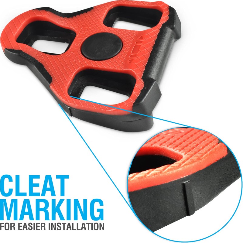 - REDUCE FREE FLOAT – Black rubber button at the center of cleat designed to reduce free float between shoe and pedal