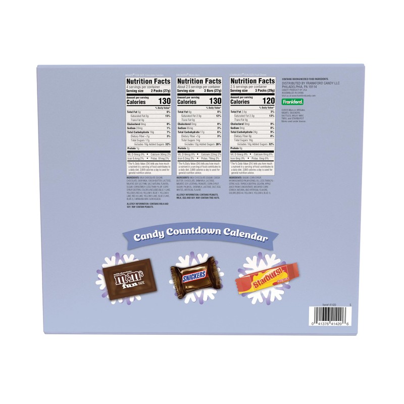 - FESTIVE COUNTDOWN CALENDAR: 24-day holiday advent calendar featuring popular candies including M&M'S, Snickers, and Starburst for daily treats leading up to Christmas