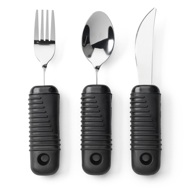 - Complete set: This 3-piece Built up utensils for adults includes a fork, knife, and spoon, providing everything you need to enjoy a meal with enhanced stability and comfort. This set is perfect for those who have difficulty eating, and it can be used in a variety of settings, including home, assisted living, and rehabilitation centers.