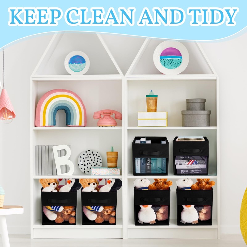 Marsui 12 Pcs Clear Storage Bins Collapsible Cube Storage Bin with Window Daycare Storage Organizer Bins Fabric Storage Bins for Kid Room Nursery Playroom(Black,Solid)