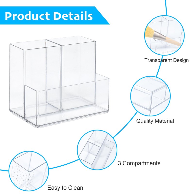 This acrylic pen cup with large capacity has 3 compartments for easy organisation and classified storage.