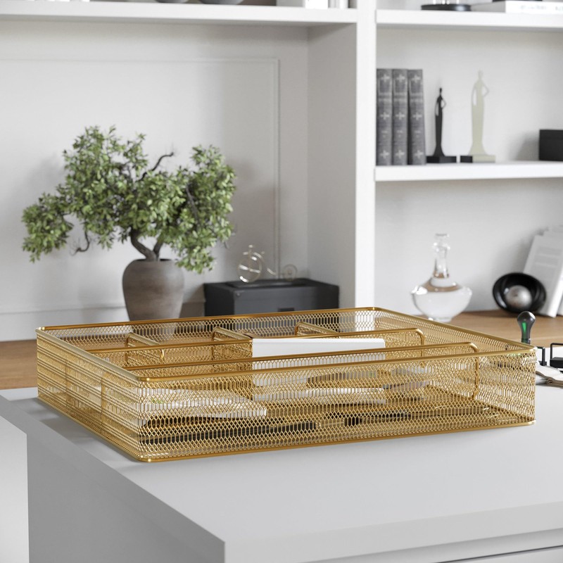 Martha Stewart Ryder Gold Mesh Metal 6 Compartment Large Desk Drawer Organizer for Accessories and Office Supplies