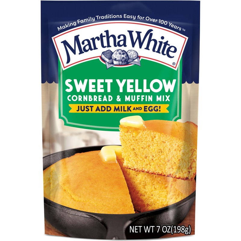 Martha White Sweet Yellow Cornbread and Muffin Mix come in a 7 ounce pack. Martha White makes a variety of easy-to-use cornbread mixes-packaged in convenient pre-measured pouches. All you have to do is mix. Add milk or milk and egg to make just the right amount of cornbread for one meal. Corn Muffin Mix is made from yellow corn meal, and makes muffins that are sweet and cakey. It is packaged in a small box.Martha White has a rich history of providing high-quality products. Throughout the years, the Martha White brand has been indispensable in kitchens across the south, with product offerings designed for modern-day convenience as well as time-honored and new recipes alike. At the heart of all Martha White endeavors lies a commitment to providing quality, innovative baking ingredients. Today, Martha White remains true to its successful recipe: easy-to-bake foods with down home flavor.