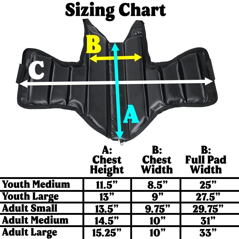 - Front double closure (zip-up + velcro) ensures your chest guard is easy to put on (and stays on!)