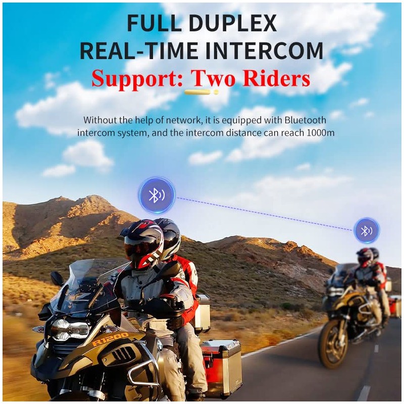 - 2 people intercom; Bluetooth 5.1 connectivity ranged in 1000 meters; Advanced Waterproof, Dustproof and Sun Protection Design with FM Rideo;