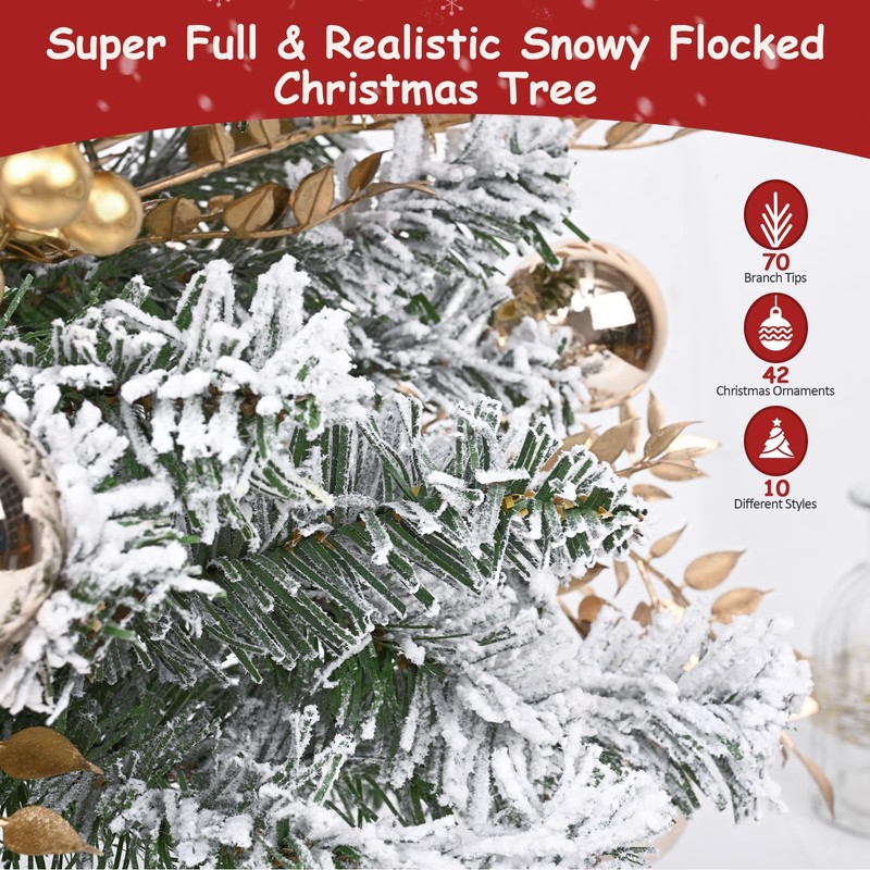 MARTINE MALL 2FT Pre-Decorated Small Christmas Tree with Lights, Artificial Tabletop Mini Christmas Tree Snowy Flocked Xmas Trees with Gold Poinsettia Bow Ball Ornaments for Table Desk Small Space