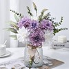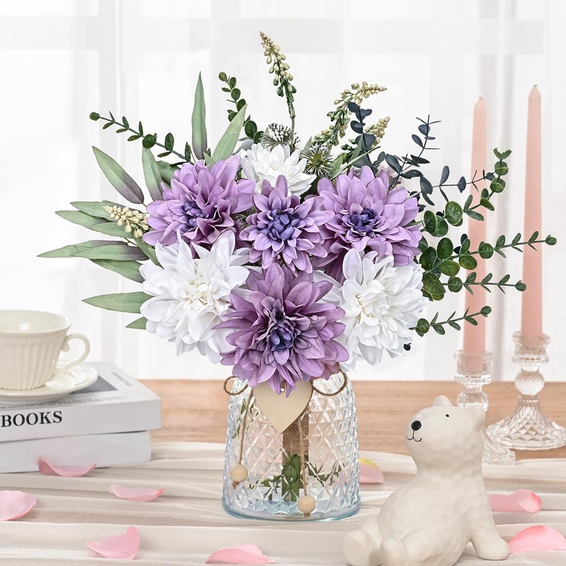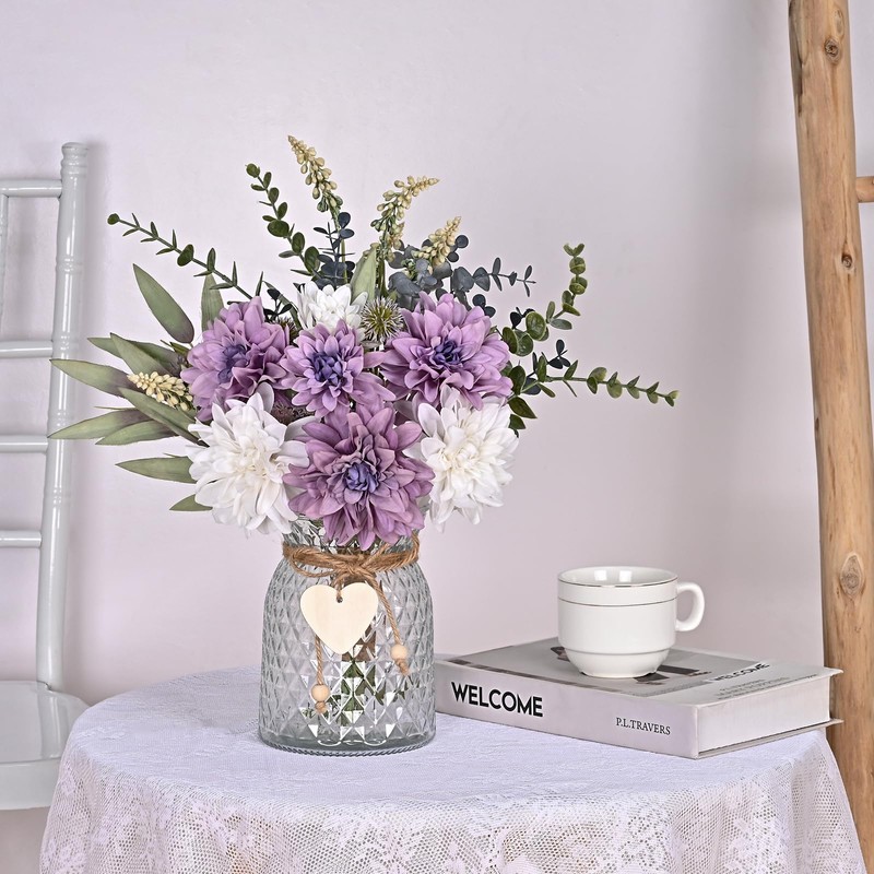 - FULL OF CLEAN & CLASSIC ACCENT-3 white dahlia and 4 purple dahlia bring out the best in each other, making the whole artificial flowers in vase full of clean vibe. The translucent thick vase has a nice texture on the glass, and the little wooden heart tag also adds a delicate finishing touch.