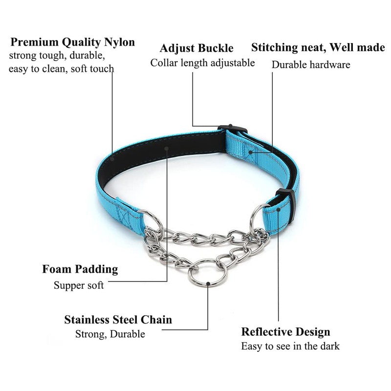 Martingale Dog Collars, Reflective Nylon Soft Padded Dog Training Collar Half-Check Stainless Steel Chain Anti-Escape No Pull Dog Choker Collar, Limited Chain Cinch Collar for Small Medium Large Dogs