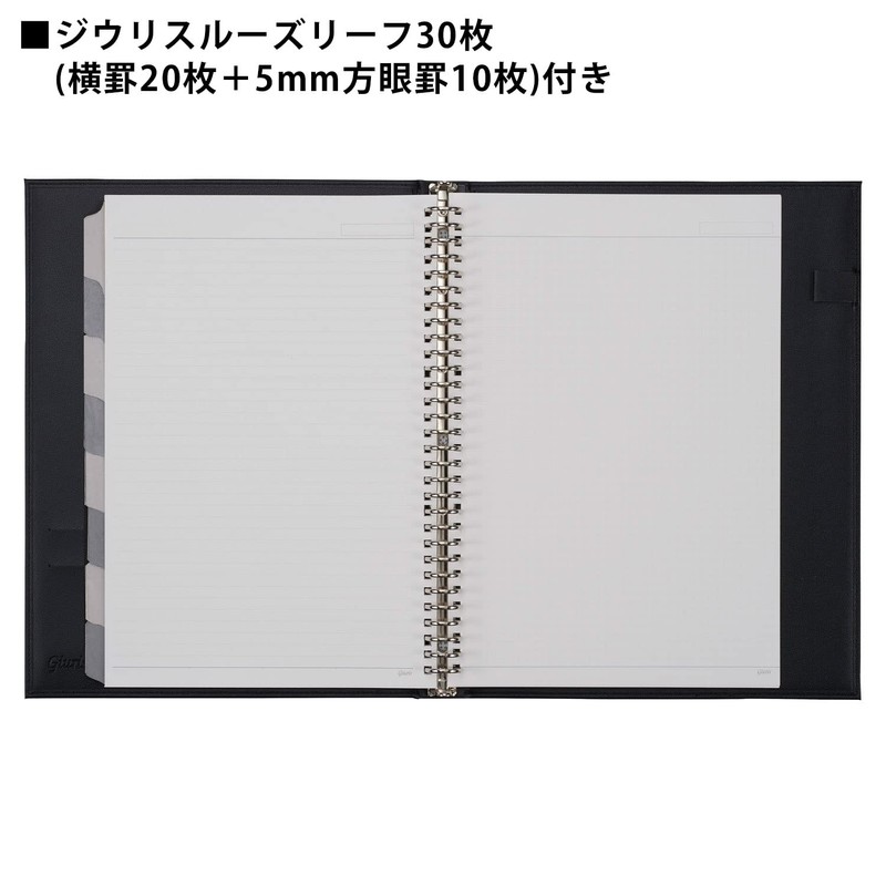 • Paper: Writing Paper: 3.5 oz/yd2 (90 g/m2), Text: 30 sheets (Jiuris Loose Leaf 0.3 inch (7 mm) Horizontal Rule, 20 sheets/Jiuris Loose Leaf 0.2 inch (5 mm) grid rules), 8 original laminated tab indices