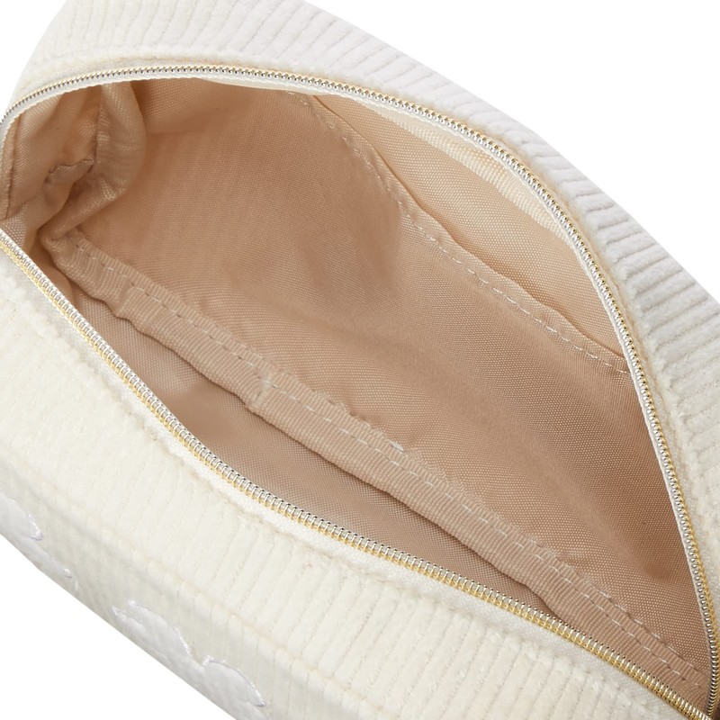 - Size (H x W x D): Approx. 4.3 x 6.3 x 2.4 inches (11 x 16 x 6 cm); Country of Origin: China; Composition: Outer Fabric: Cotton; Inner Fabric: Polyester Embroidered Thread: Polyester Applique Portion: Cotton; Specifications: Corduroy fabric, Fur applique embroidery, Embossed name; For makeup pouch or small items