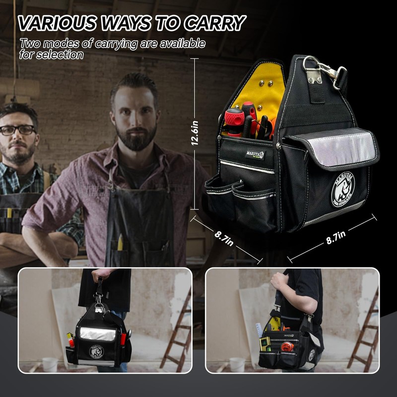 - ⚒️Abundant Storage Capacity: Marutai tool tote bag has 36 pockets in total, 17 inside, 19 outside which provide quick and easy access for tools. The interior is divided into 2 compartments to facilitate the classification of tools. Also with 8 moll rings and 1 tape measure buckle.