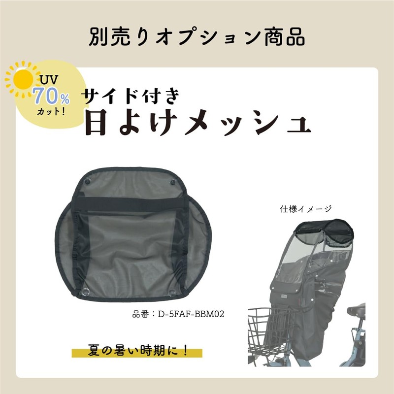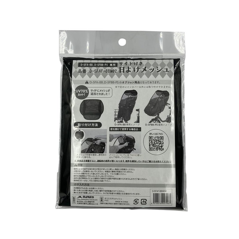 Product Name: Sunshade Mesh, D-5FAF-BBM02, Product Number: D-5FAF-BBM02, Material: Polyester Mesh, PVC; Uses: D-5FA-BB02/D-5FA-BB01/D-5FBB-PS, Optional Items: Color: Black. *This product is only a shade mesh. The child seat cover in the picture is not included. Care Instructions: Please avoid machine washing or hand washing. After getting wet, let it air dry in a shady and ventilated place. Please do not leave it out wet. It may cause mildew or fading. Caution: This product will lose your vision when driving. Please refrain from purchasing if you want to keep your vision. Please replace it with a new product if the parts or fabric become deteriorated over time. Do not use near fire. This product is not flame retardant. Please be careful not to let small children play with it. Please do not scratch it with sharp protrusion objects. Please note that discoloration and discoloration cannot be avoided even when used under normal circumstances. Please avoid using it without leaving it for a long time.