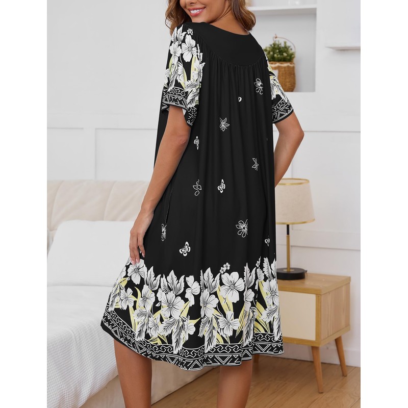 Marvmys Women Mumu Dress with Pockets Floral Print House Dress Moo Moo Nightgowns Loungewears Black XL
