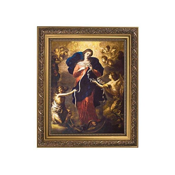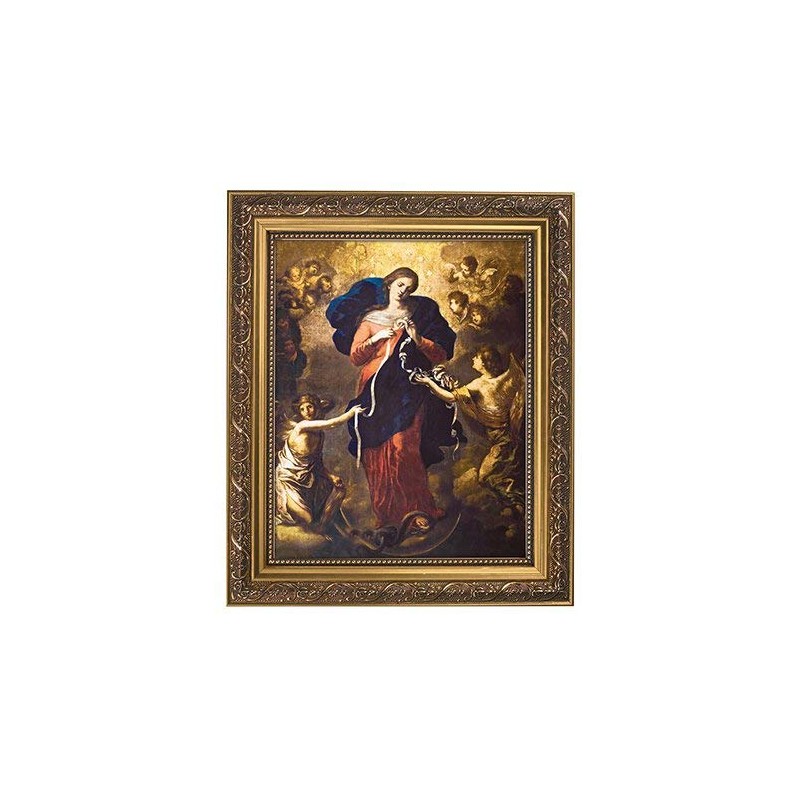 Print is Framed in an Ornate Gold Toned Finish Frame - Inspired by the 18th Century Baroque Painting. - Polystyrene / Glass / Cardstock - 11 Inch (W) x 13 Inch (H) - Includes Easel Back and Metal Hanger for Wall Mounting - Many Ask Mary for Her Intercession to Reduce the Knots of Pain, Stress or Sadness Encountered Daily