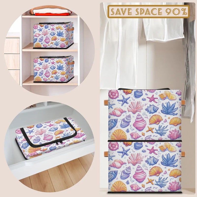 MARYHFENVA Ocean Starfish And Seashells Storage Bins with Zipper Lid Fabric Lidded Storage Baskets Boxes Foldable Washable Closet Shelf Clothes Organizer Container with PU Leather Handles