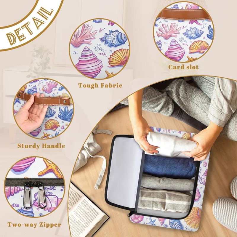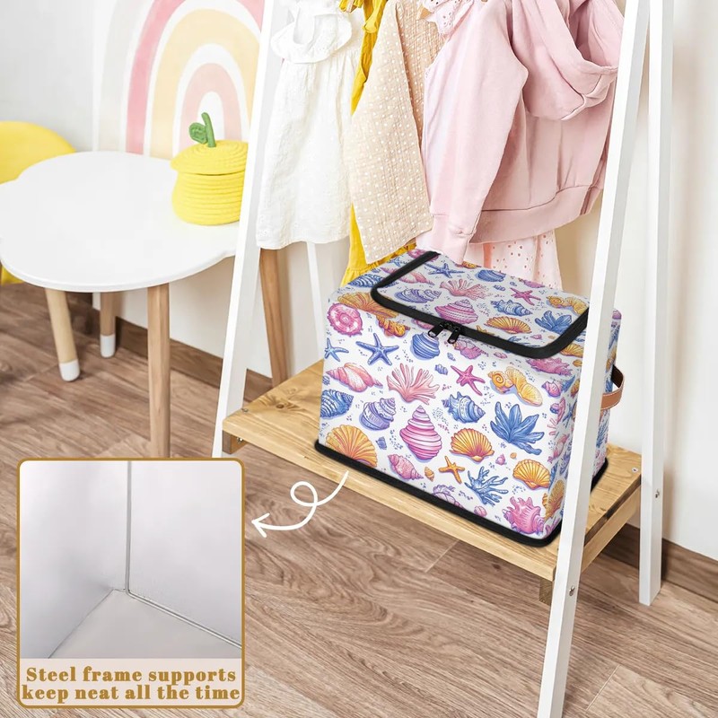 MARYHFENVA Ocean Starfish And Seashells Storage Bins with Zipper Lid Fabric Lidded Storage Baskets Boxes Foldable Washable Closet Shelf Clothes Organizer Container with PU Leather Handles