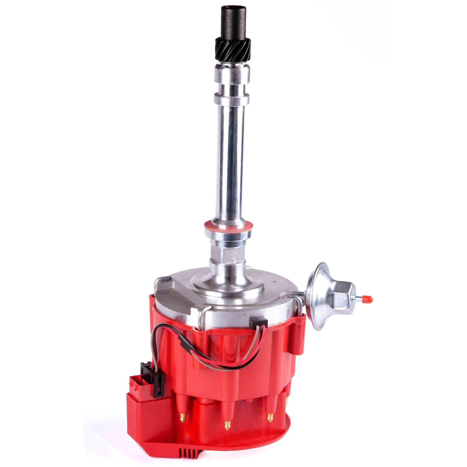 Fully CNC machined and polished housing with adjustable vacuum advance.  Each distributor has a 65,000 volt Super Coil and high performance 4 pin module to insure accurate and reliable timing to 7,500 RPM.  Has Accel style coil cover which acts as wire retention and helps dissipate heat away from the coil.  The 4340 Chrome moly gear will work with cast or billet cams.  Premium cap with brass terminals.  True spark alignment for instant throttle response.
