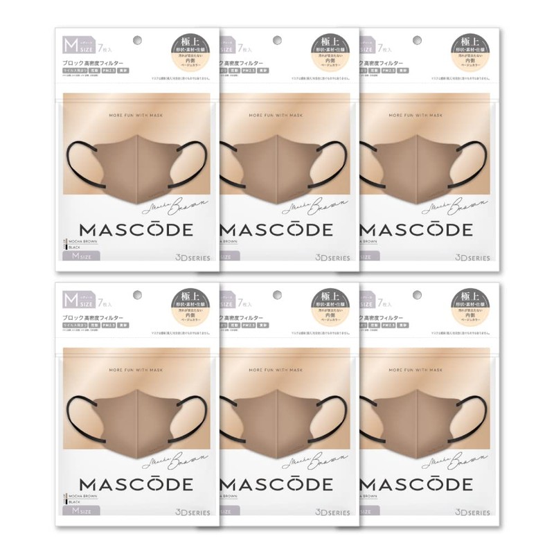 [MASCODE] 【 マスコード 公式店】マスク 不織布 バイカラーマスク 血色マスク 立体 花粉症 大きめ 小さめ 3Dマスク Mサイズ 6袋セット(1袋7枚入) (モカブラウン(ブラック紐))
