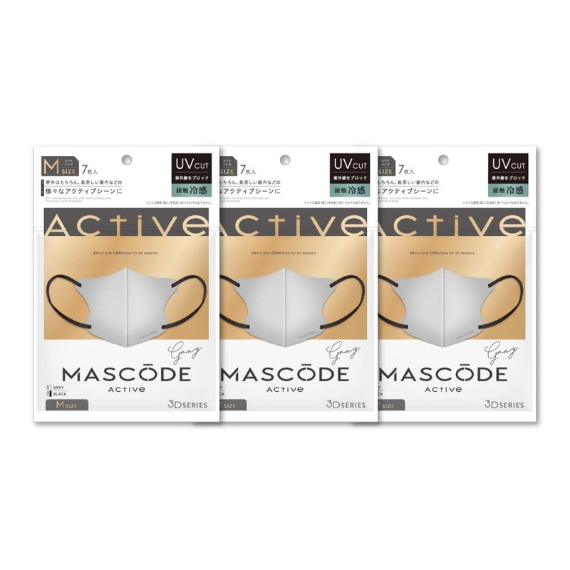 [MASCODE] 冷感マスク UVカット マスク 不織布 マスク 立体 バイカラーマスク 花粉【 マスコード 3Dマスク アクティブシリーズ 3袋セット(1袋7枚入り) (【M】 グレー×ブラック紐)