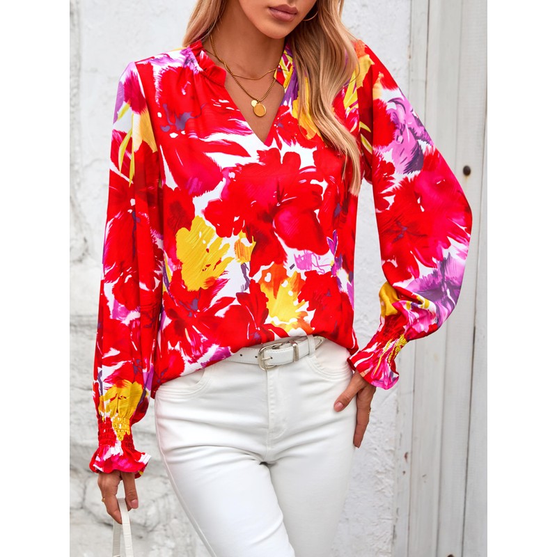 MASCOMODA Womens V Neck Floral Long Sleeve Tops 2025 Summer Casual Loose Puff Sleeve Chiffon Boho Work Blouse Dressy T Shirts(Red,Large)