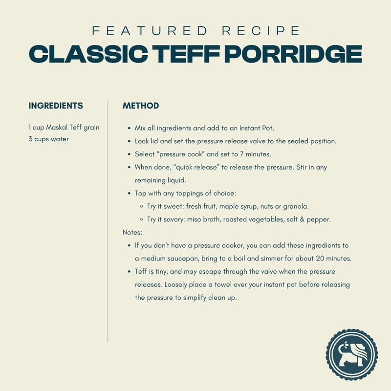 - Premium teff grain grown in the United States. USDA Organic and Non-GMO certified for guaranteed purity and quality in every 14 oz bag. Maskal Teff's Brown Teff Grain offers a rich, earthy taste that's perfect for both traditional and modern recipes. Each serving provides impressive nutrition with 5g of protein, 5g of fiber, and 4mg of iron, making it an excellent choice for health-conscious baking. Great for traditional Ethiopian dishes, plus delicious hot cereal, grain bowls, soups, and stews. Convenient resealable bag keeps your ancient grain fresh. No additives or preservatives.