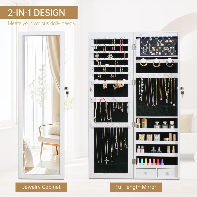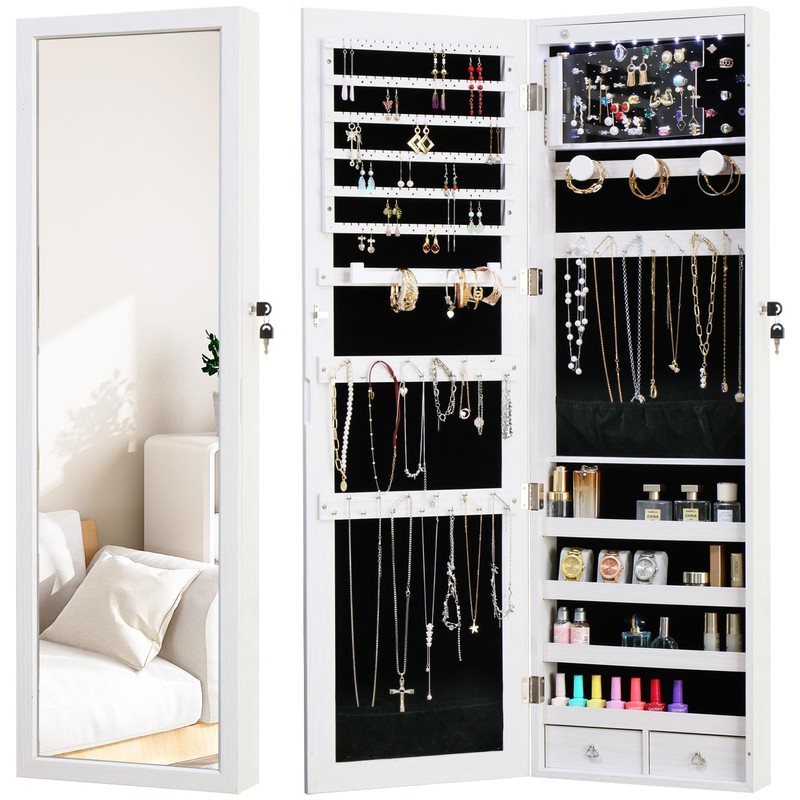 - LOCKABLE FULL-LENGTH BODY MIRROR WITH STORAGE: The enormous mirror, measuring 11.8"L x 44.48"H, shows your entire outfit from head to toe. You can quickly and easily see your whole outfit in the jewelry mirror full length and the glass mirror improves performance while making your space appear brighter and larger. The lock on the jewelry armoires keeps children away from your valuables and keeps them secure. (Two keys are included).