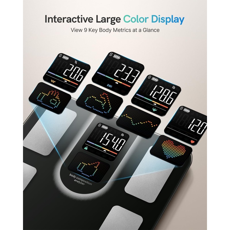 - Clear VA Display, 9 Key Insights: This smart scale for body weight shows Weight, BMI, Body Fat, Muscle Mass, Heart Rate & Body Type — plus User ID, Trend Arrows, and Motivation Icons, even offline