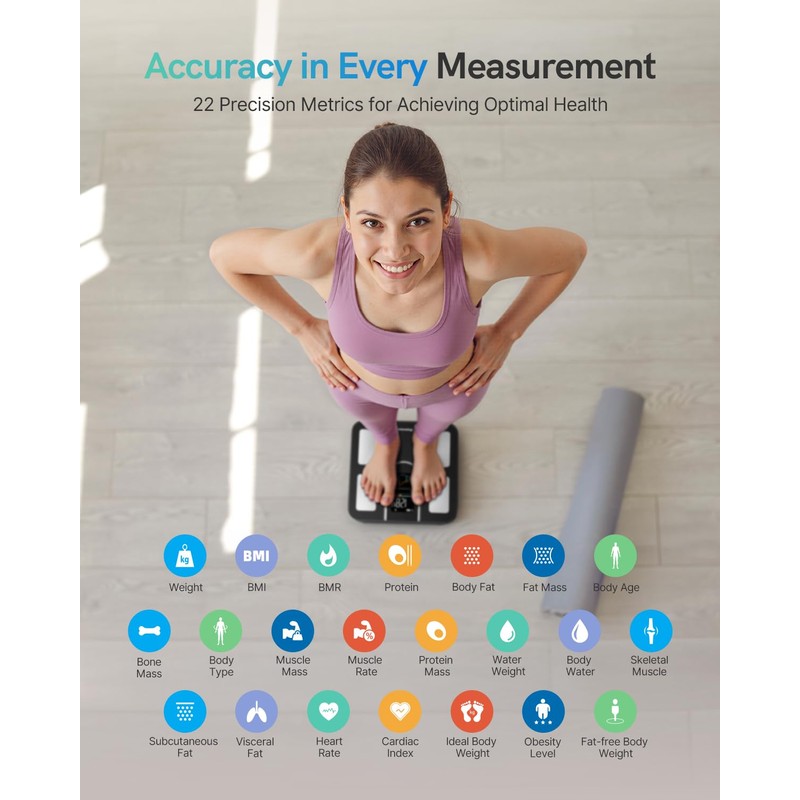 - 22 Body Metrics for Full Health View: More than a bathroom scale, it tracks 22 essential stats like Weight, Heart Rate, BMI, Body Fat, and more for total body analysis