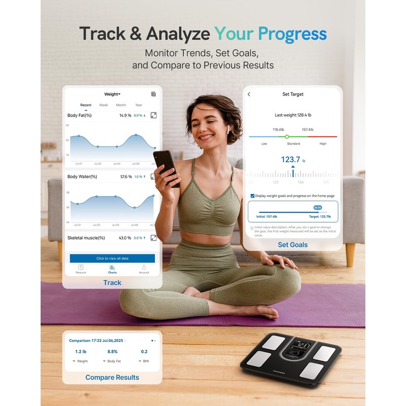 - Smart Sync & Trend Tracking: Sync your bathroom scale with Apple Health, Google Fit, Samsung Health & Apple Watch. Monitor progress and share results easily
