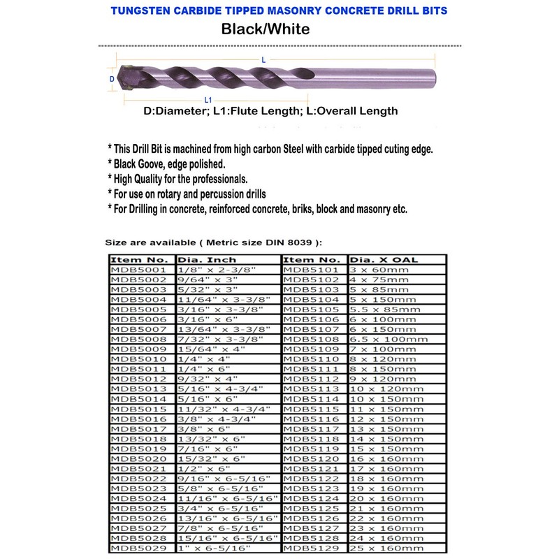 • Masonry Drill Bit Size: 5/16"(Diameter) x 4-23/32" (Overall length)