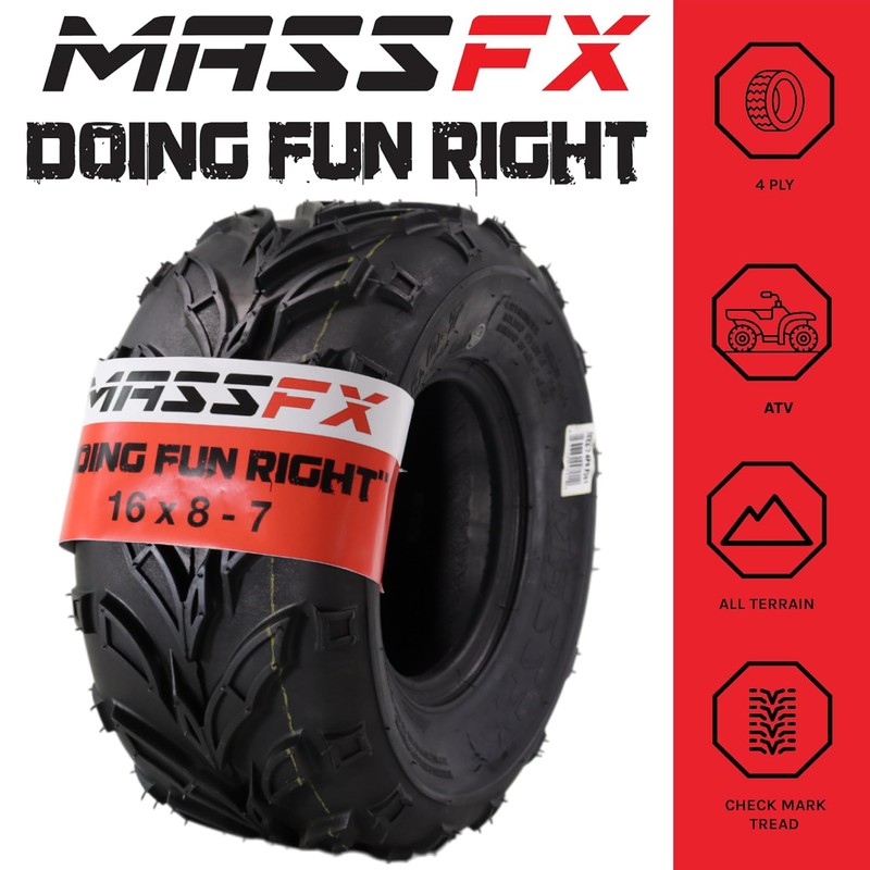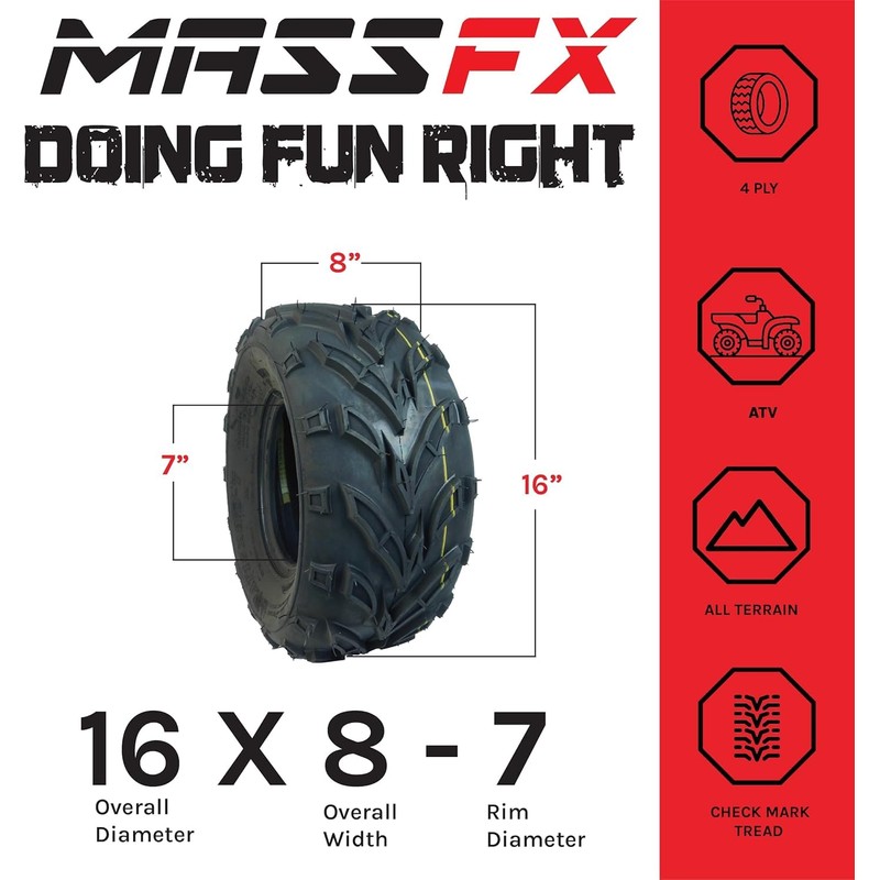MASSFX 16x8.00-7 front or rear Mini ATV, Go Kart, or Lawn Equipment Tires - 4 Ply Rating - 9 mm Tread Depth - Heavy-Duty Construction - Versatile Size for Various Equipment - 16x8x7 (4 Pack)