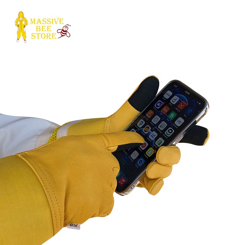 Massive Bee Cowhide Beekeeping Ventilated Cowhide Leather Gloves Yellow Rubber Cuff Then Yellow Mesh with Off white jeans (Large, TouchScreen Gloves)