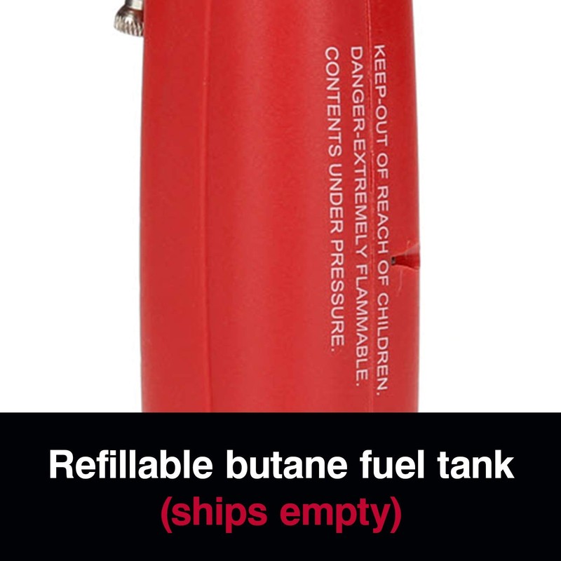 - 2-hour runtime per full tank: A hands-free slide lock enables continuous use as well as instant off operation; conveniently refill the butane fuel tank as needed (tank ships empty)