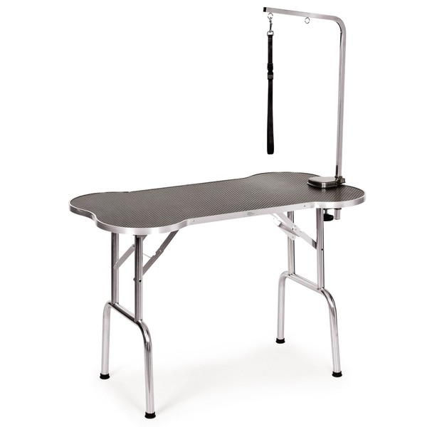 The Master Equipment Bone-Shaped Folding Grooming Table is a convenient grooming essential with an innovative design! Patent-pending bone-shaped tabletop is tapered on the sides to give groomers closer access to pets when they cut. The Master Equipment Bone-Shaped Folding Grooming Table combines elegant design with durability to produce a stable staging ground for pet groomers.