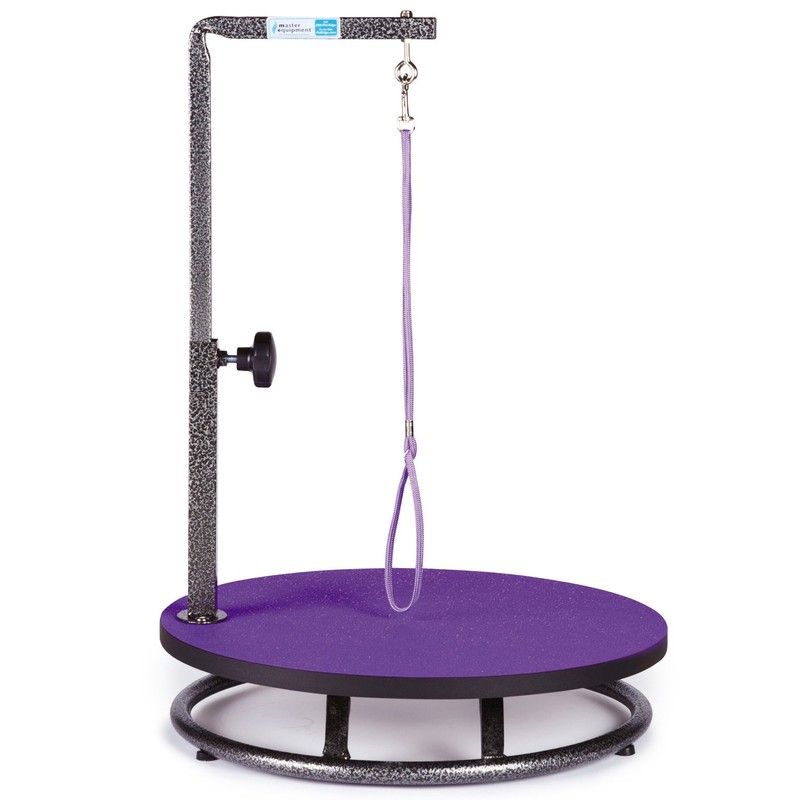• An easy-clean, non-slip, 18" diameter tabletop • A ¾" square-tube grooming arm extending from 16¼" to 23½" • A coordinating-color grooming loop • Rubber feet that keep the table in place • Blue, purple, or black hammertone powder-coated metal coordinates with other equipment in the line • Can be used on any flat surface