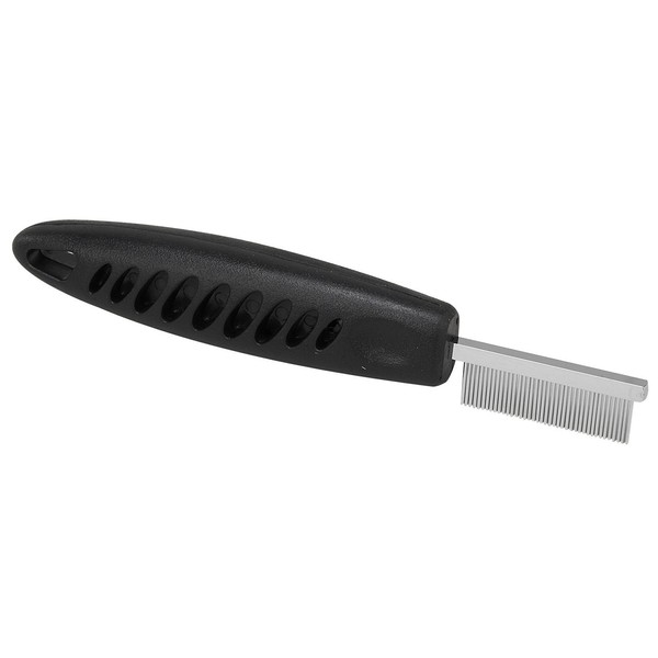 Master Grooming Tools Face and Finishing Comb features 40 tightly spaced ?" stainless steel pins to rid hair of debris from tear stains, food, and dirt. Ergonomic handle makes combing easy on the hand Helps reduce fatigueGrip is high impact plasticStainless steel teethPlastic handle has a hole for hangingMaterial: High impact plastic for the grip; stainless steel teeth Size: Comb measures 6?" long and has 40 pins