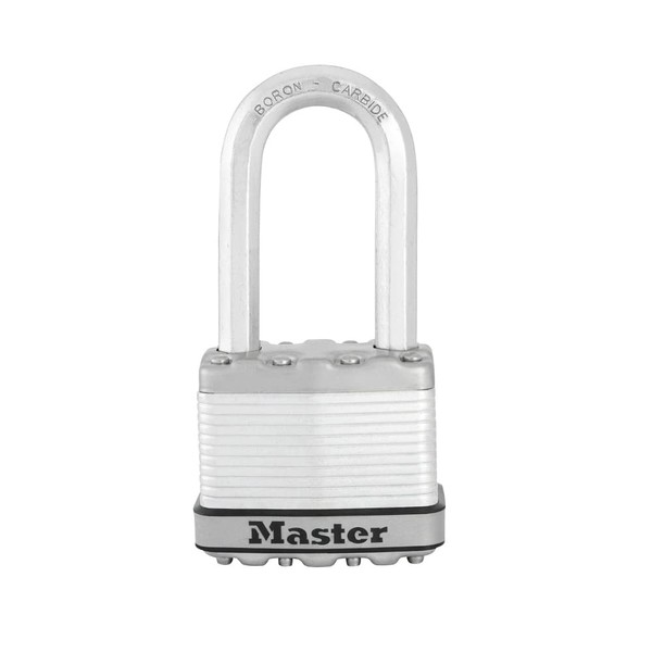 The Master Lock Magnum M5XDLH Laminated Padlock with Key features a 2 in. (51 mm) wide laminated steel body for maximum strength and reliability, and is surrounded by stainless steel and zinc outer components for weather resistance. The 3/8 in. (10 mm) diameter octagonal shackle is 1-1/2 in. (38 mm) long and made of Tough-Cut boron-carbide, 50% harder than hardened steel, offering maximum resistance to cutting and sawing. The 4-pin cylinder prevents picking and the dual locking ball bearings provide maximum resistance against prying and hammering. The Lifetime Guarantee provides peace of mind from a brand you know and can trust.