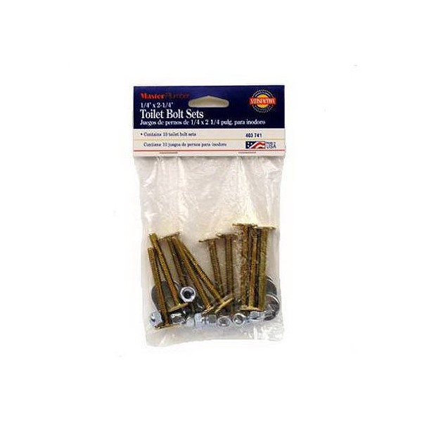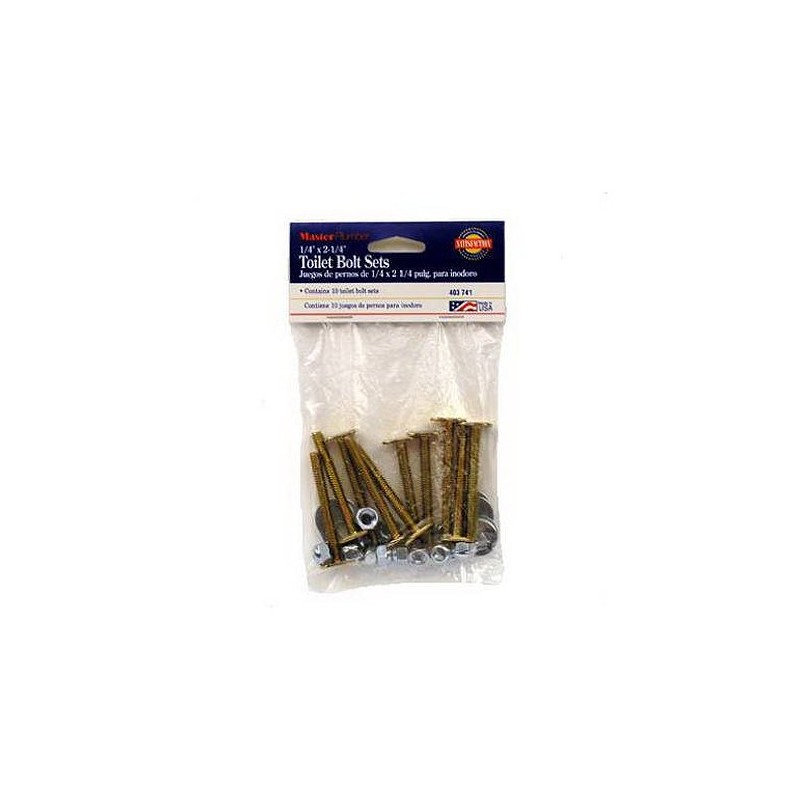 Master Plumber 403741 Brass Toilet Bolt 10 Pack 1/4" x 2-1/4" contains ten brass toilet bolts. Long lasting construction. For toilet repair.