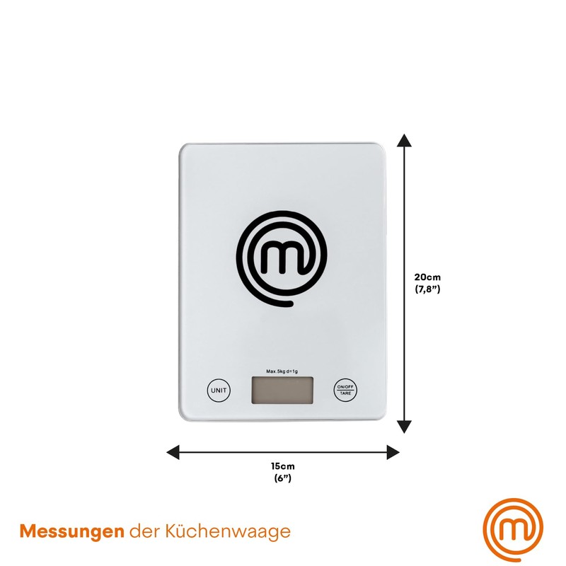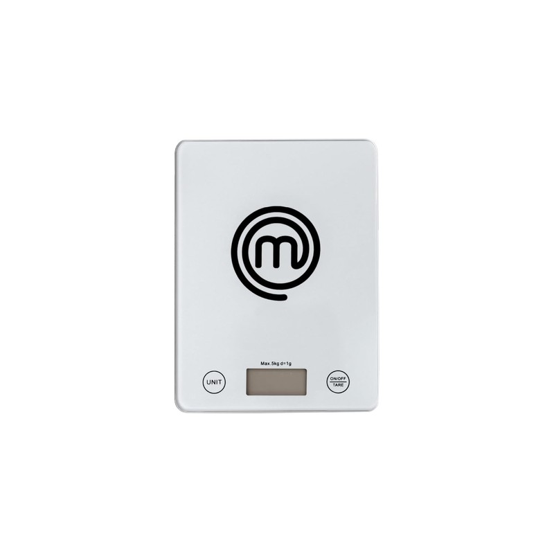 - Tare function to reset to 0 for measuring in any container, stylish design with the large official MasterChef logo in black, easy to read LCD display (47 x 16 mm), 5 kg maximum weight