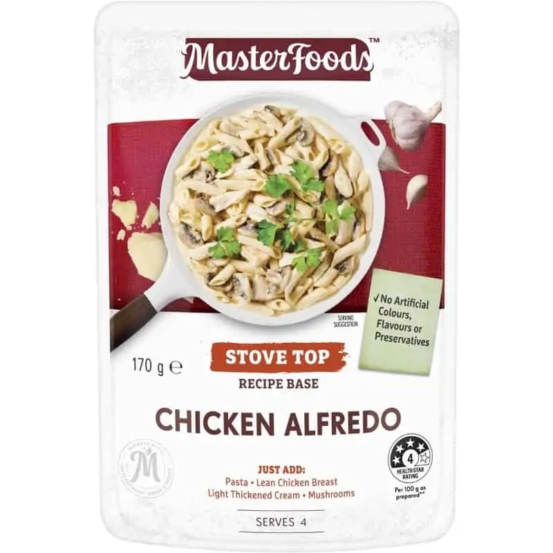 Enjoy a homemade family favourite in 30 minutes with MasterFoods™ Chicken Alfredo Recipe Base Sauce Pouch. Made with quality ingredients to deliver a creamy Alfredo dinner with plenty of flavour. Simply add lean chicken breast, pasta and light thickened cream for a delicious meal you can enjoy as part of your daily diet.