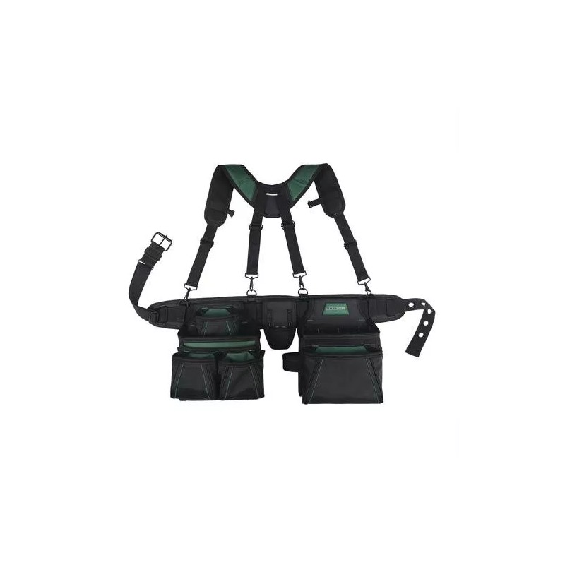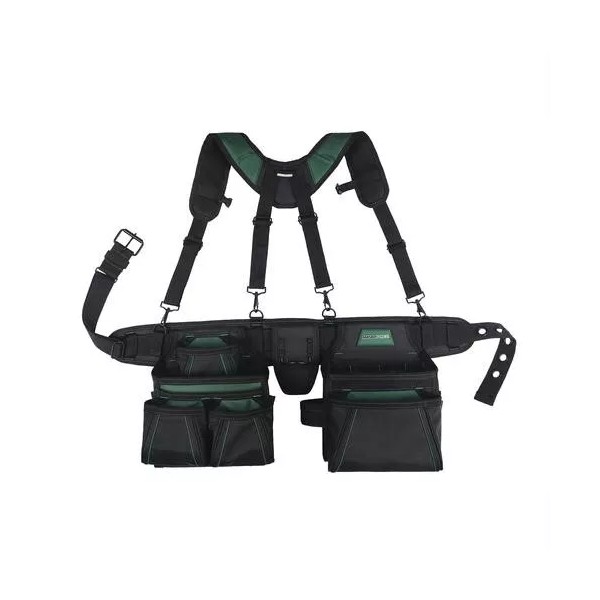 The Masterforce® tool belt with suspenders is built for the professional. Its innovative structure has plastic-walled pockets that won't collapse forward, keeping tools from falling out. The pouches stay wide open, making your tools easier to see and access. The supreme padded belt and suspenders comfortably distribute heavy loads for all-day comfort. The rig offers two hammer loops, a tape measure holder, and more to accommodate all your projects.